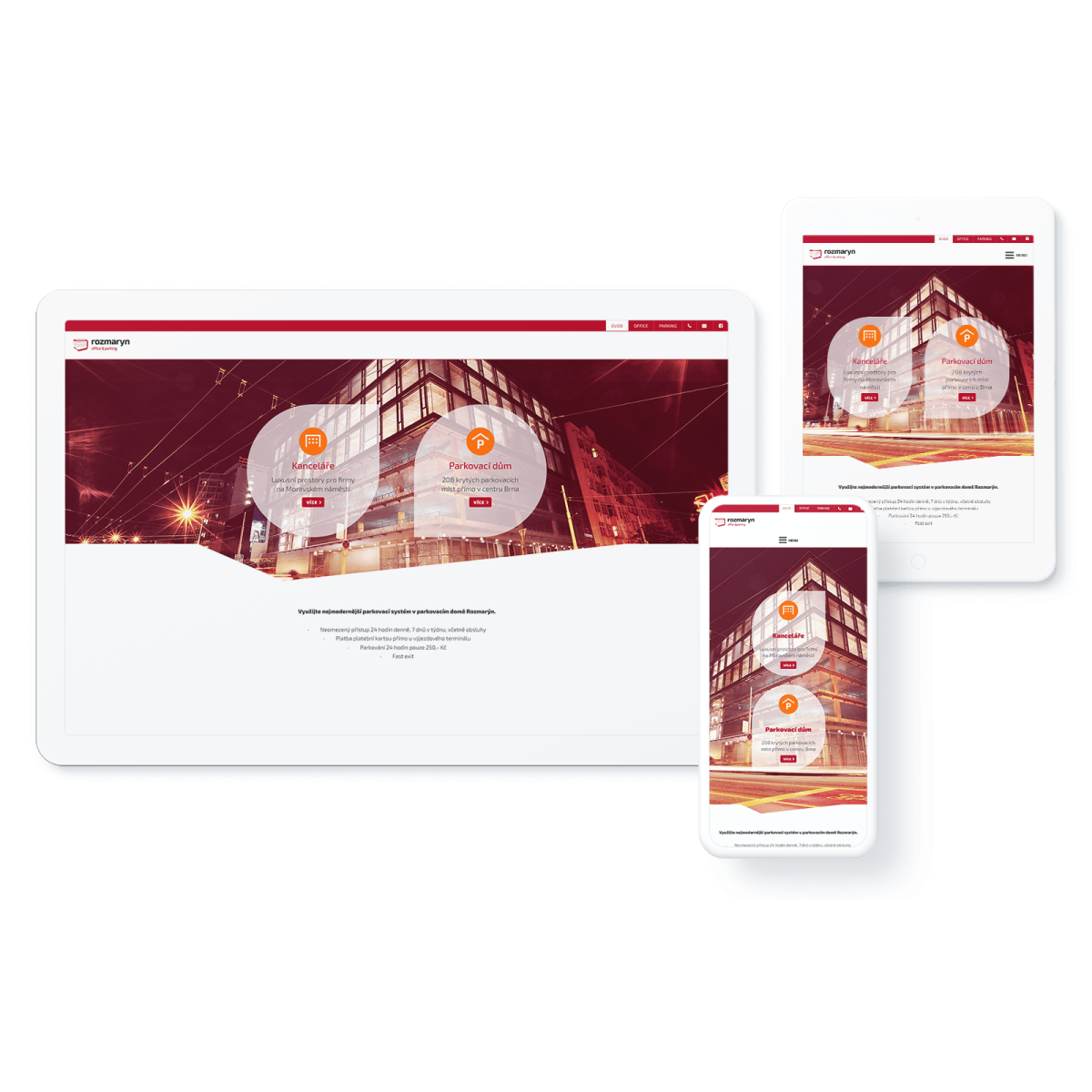 Přehledný a moderní design Webové stránky jsou nyní přehlednější, snadno se v nich orientuje a jejich vizuální atraktivita zajišťuje, že návštěvníci rychle najdou, co hledají. Moderní design a čisté linie vytvářejí profesionální dojem, který odpovídá kvalitě služeb parkovacího domu.